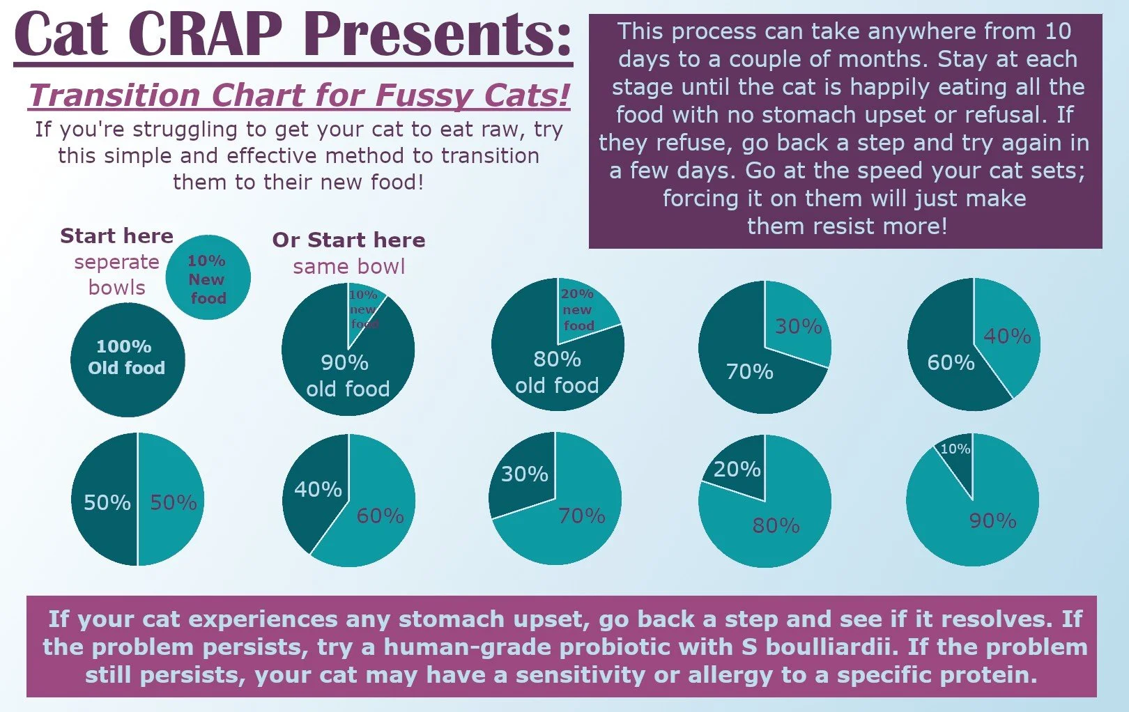 Do not keep a thawed-out tub in the fridge longer than three days. It really starts to go bad longer than this. If you have frozen your meat in some 8 oz tubs this shouldn’t be an issue. Cats need to eat 3-5% of their body weight daily. For an 8 lb cat you are looking at .24-.4lbs of raw a day. A kitten will be eating about that much as well as they are growing and should be given as much as they can eat in one sitting. RAW food can be kept out for 12 hours. What I like to do is feed my cats in the morning. Sometimes they gobble it up right away and sometimes they eat some and come back to it later. This is perfectly fine. It may dry up on top but underneath its still soft and they will eat it. Then at bed time I give them their dinner and leave it out all night. You are looking at about 1/3 a cup each meal.